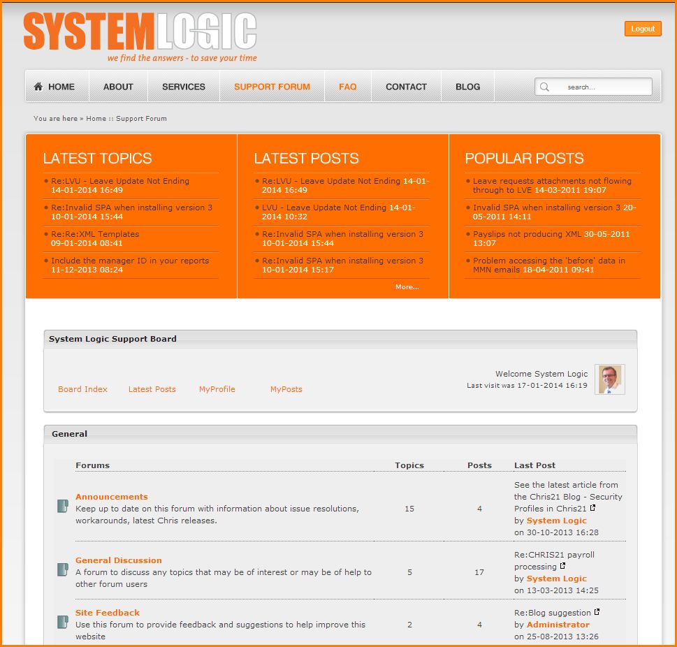 I know that many of the people that subscribe to this blog have also registered with the Chris21 support forum. This forum is a place for Chris21 users to go if they need to look for answers to problems or indeed to ask their own questions. I started the forum first, as part of the System Logic website and the Chris21 blog came later.